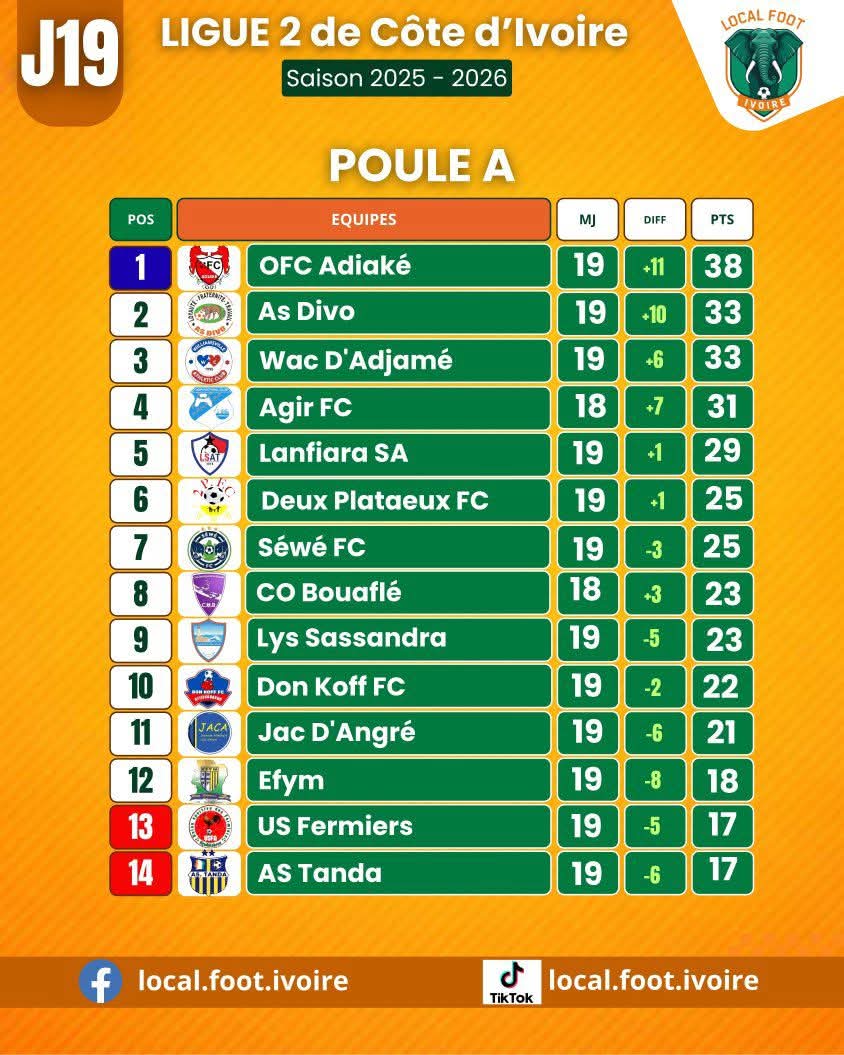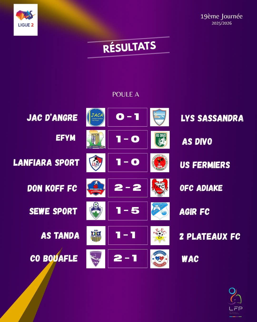 ​Dans la Poule A, le leader OFC Adiaké a été freiné dans son élan par Don Koff FC lors d’un match prolifique (2-2). Malgré ce partage des points, les Rouge et Blanc conservent la tête avec 38 points, profitant de la défaite de leur dauphin immédiat, l’AS Divo, tombé face à l’Efym (1-0). ​La sensation de la journée vient d’Agir FC, qui a littéralement écrasé Séwé Sport sur le score fleuve de 5-1. Cette démonstration de force permet à Agir FC (34 points) de monter à la 3è place, mettant la pression sur le podium. L’équipe de Guibéroua double par la même occasion Williamsville Athletic Club (4e, 33 points), qui a chuté face au CO Bouaflé (1-2). En bas de tableau, la situation devient critique pour l’AS Tanda et de l’ US Fermiers, tous deux bloqués à 17 points après leurs résultats respectifs.