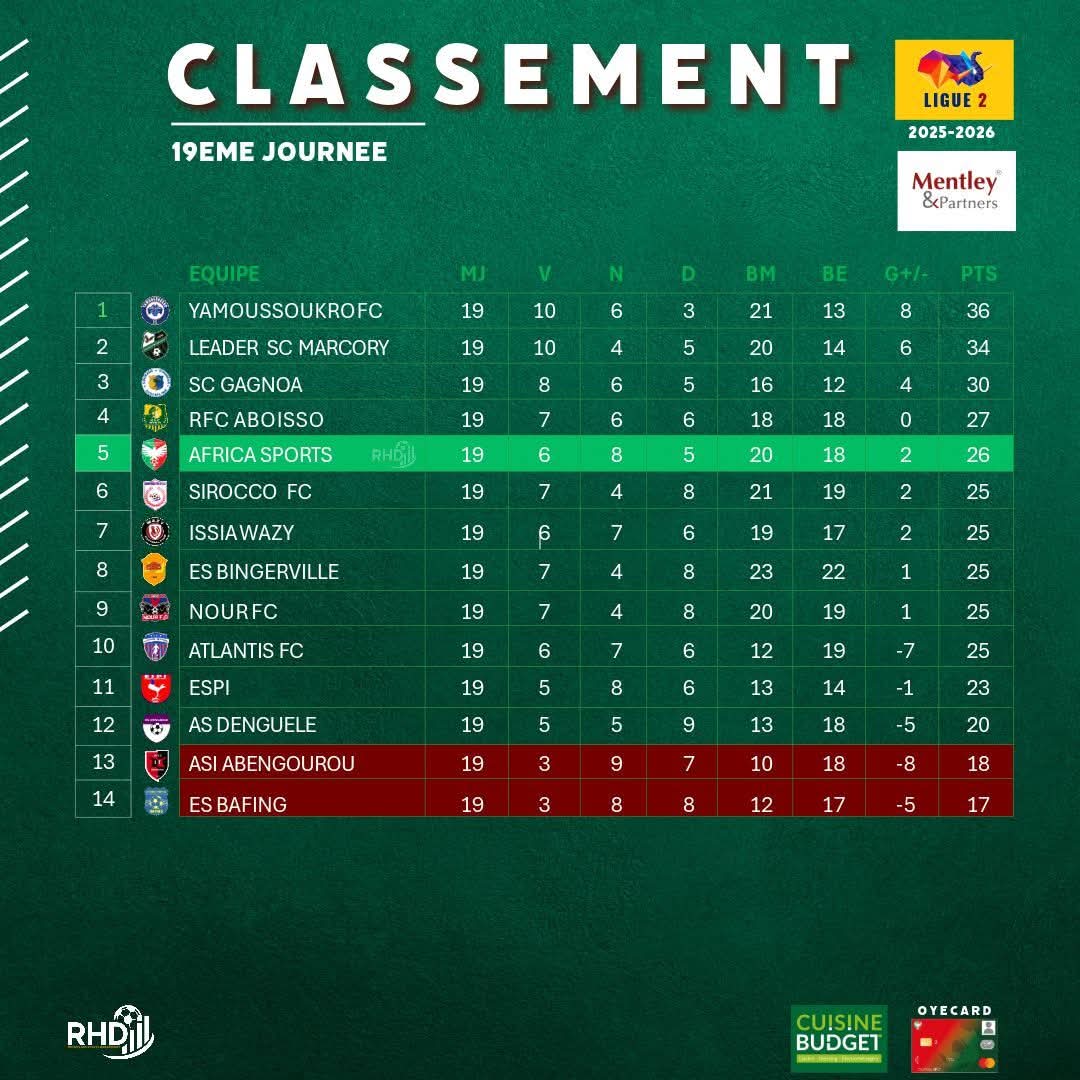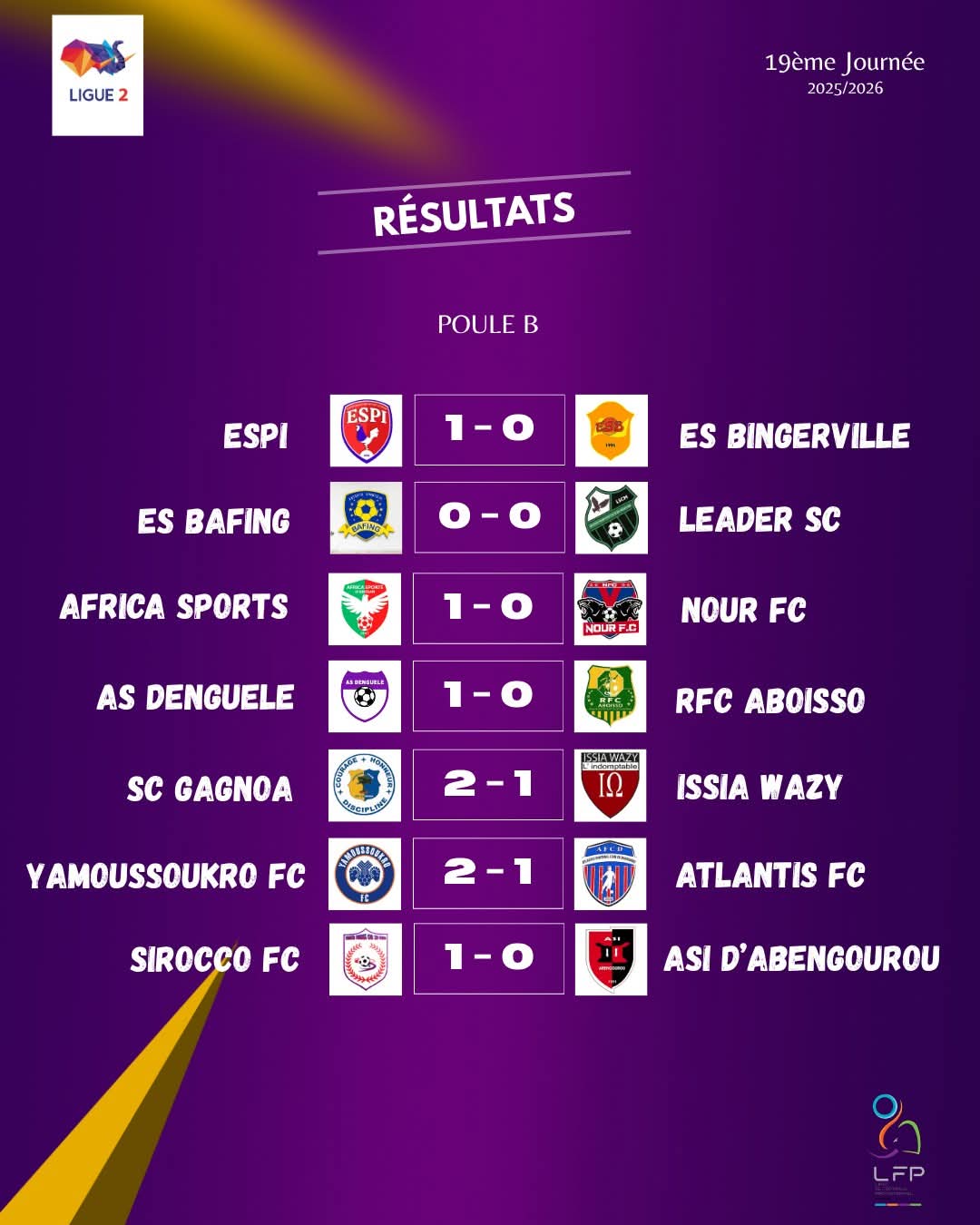​Du côté de la Poule B, Yamoussoukro FC a réalisé la bonne opération en s’imposant 2-1 face à Atlantis FC. Avec 36 points au compteur, les Béliers prennent une option sérieuse sur la montée. Leur poursuivant direct, Leader Sporting Club, a été tenu en échec par la lanterne rouge ES Bafing (0-0), un coup d’arrêt qui les laisse à deux longueurs du sommet. L’Africa Sports, malgré un match difficile, a assuré l’essentiel en disposant de Nour FC (1-0). Cette victoire permet aux Aiglons de remonter à la 5ème place (26 pts), bien que l’écart avec le leader reste conséquent. Le Sporting Club de Gagnoa s’est relancé en venant à bout d’Issia Wazy FC (2-1) dans le derby des frères Bhété. En bas de classement, la lutte pour la survie est acharnée : seulement trois points séparent le 6è (Sirocco FC, 25 points) du 11è (Espérance d’Issia, 23 points), rendant chaque match crucial pour la suite.