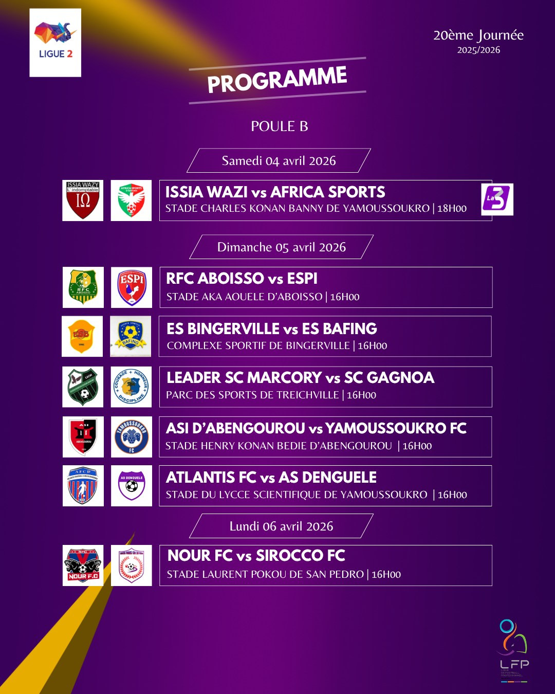 Cette journée sera marquée par le choc Leader Sporting Club Marcory face au Sporting Club Gagnoa. Un match où les 2 équipes jouent pour l’espoir dans la lutte au titre.