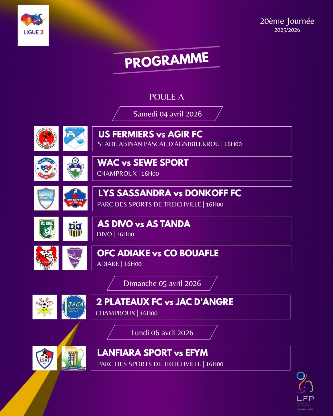 AS Divo et Williamsville Athletic Club (WAC), tous les 2, à 5 points du leader OFC Adiaké vont animer la course-poursuite. Dans le bas du tableau, il faudra suivre les positions de EFYM, US Fermiers et AS Tanda qui se tiennent en 1 seul point.