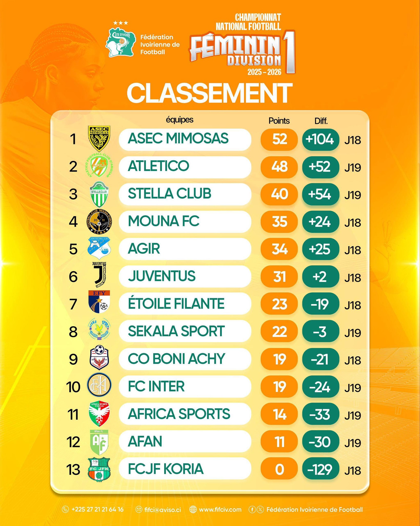 Le leader ASEC Mimosas, 52 points, va tenter de conduire sa série de victoires consécutives à 14 face à CO Boni Achy qui a perdu sa dernière rencontre. Un adversaire, avec 19 points, qui n’est pas à encore à l’abri de cette zone rouge. Les jeunes filles de Koria déjà condamnées à la descente avec 0 point au compteur ont pour objectif de faire mieux après la dernière déroute (00-21). Ce ne sera pas facile car c’est Atletico d’Abidjan qui sera en face. Les orange et vert, qui comptent 4 unités de retard sur l’ASEC sont toujours dans le rétroviseur, en attendant un éventuel faux pas.