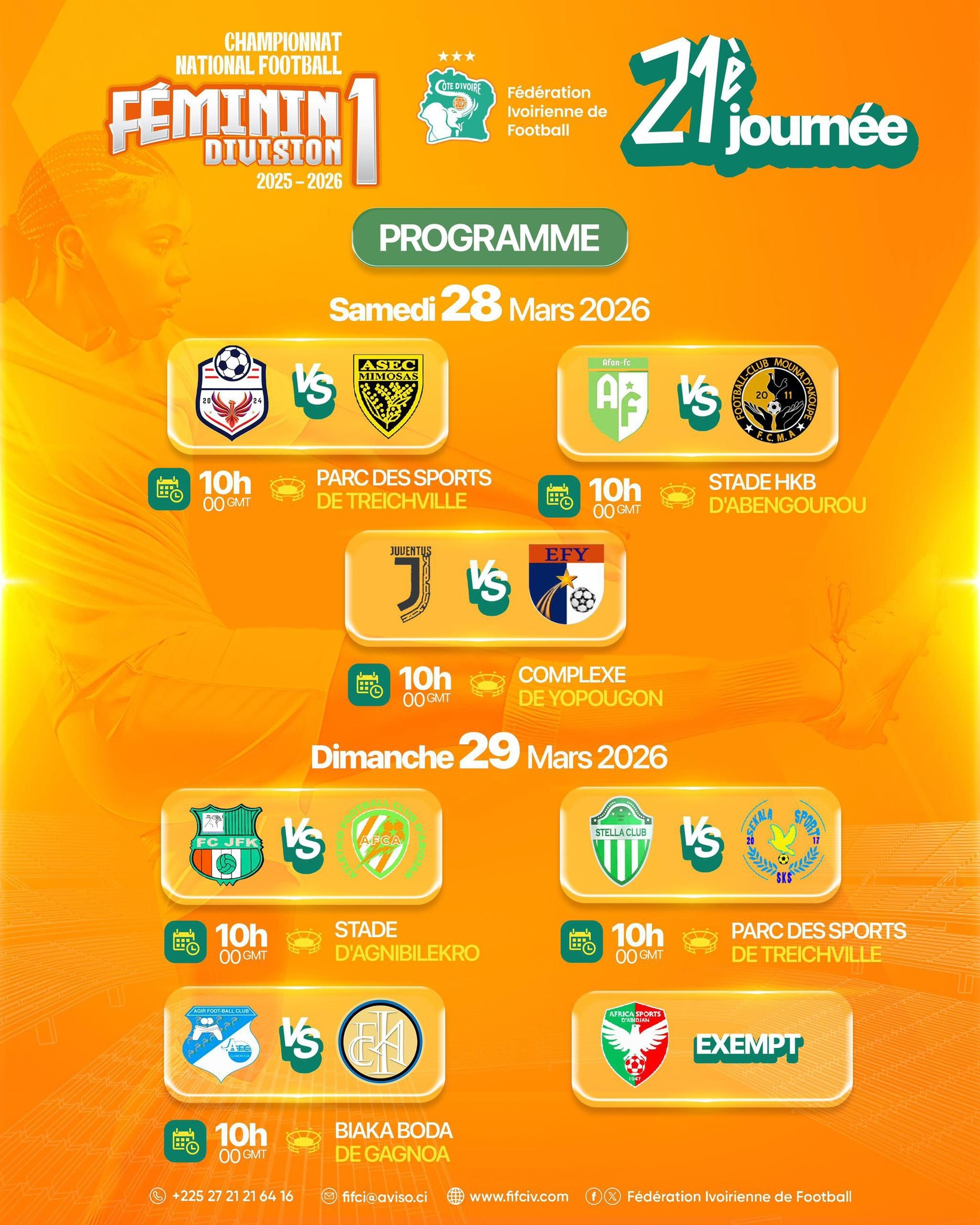 L’Africa Sport, exempt de cette journée, va suivre ces 2 autres concurrentes qui vont disputer des matchs face à 2 adversaires du top 5 qui rêvent de podium. Les filles venues d’Abengourou, AFAN, actuellement dans la zone rouge (12e), avec 11 points seront face à FC Mouna (4e) avec 35 points. AGIR de Guibéroua, 5e avec 1 point de moins sur Mouna retrouvera à Gagnoa, l’Inter d’Abidjan, 10e avec 19 points. Une compétition qui va se disputer samedi et dimanche avec 3 matchs chaque jour.