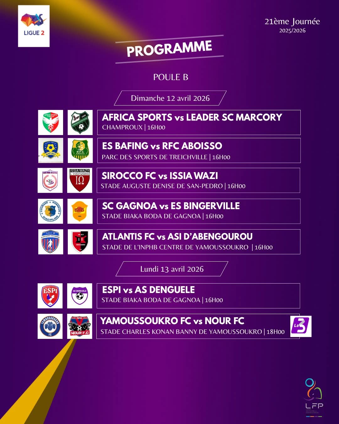 La Poule B propose l’affiche la plus prestigieuse de cette journée. Le dimanche 12 avril, l’Africa Sports (5e, 29 points) reçoit le Leader Sporting Club (2e, 37 points). Pour les Vert et Rouge, c’est le match de l’ultime espoir pour recoller au peloton de tête. Pour Leader SC, une victoire mettrait une pression immense sur le leader actuel.