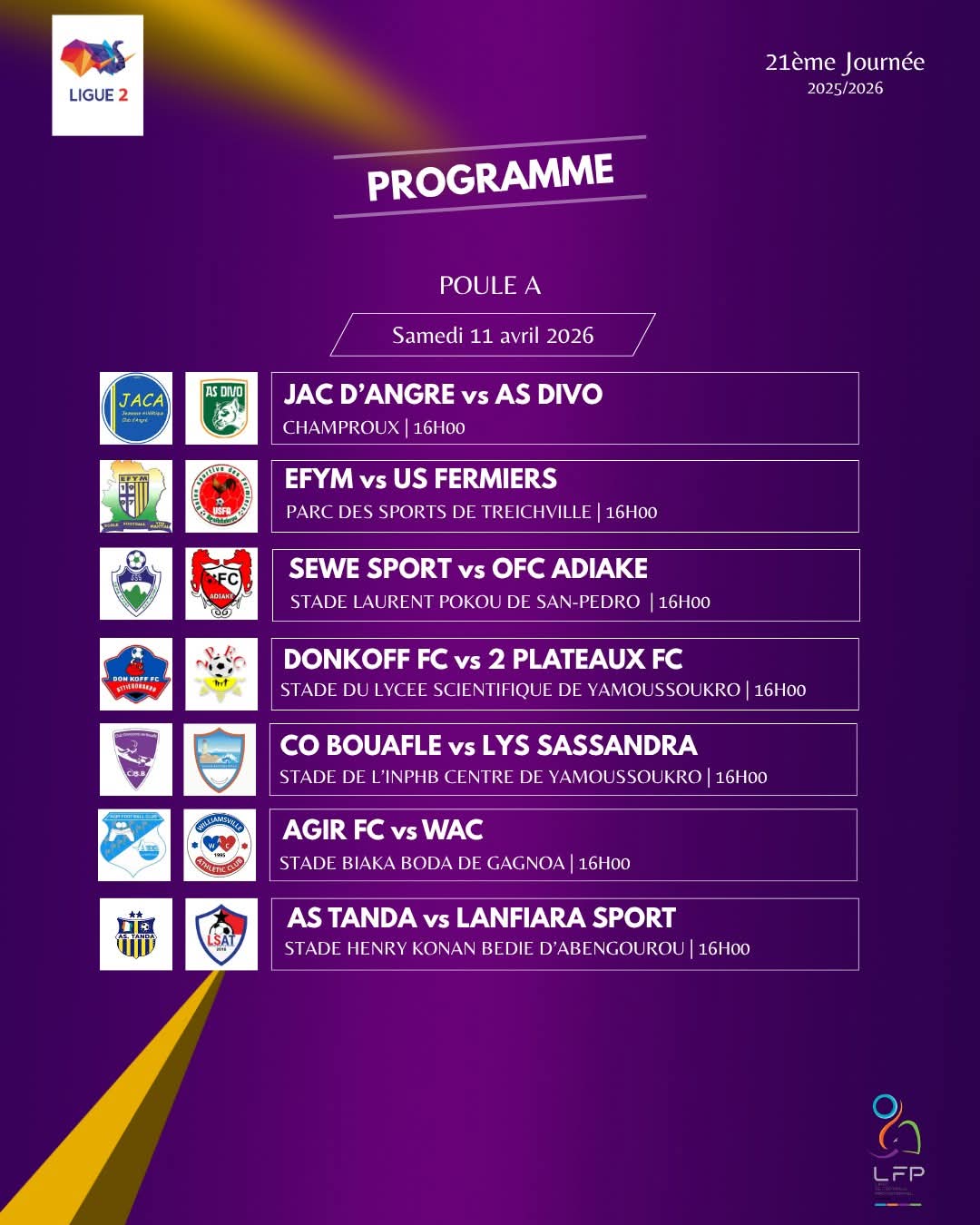 En bas de classement, l’AS Tanda, lanterne rouge avec 18 points, reçoit Lanfiara Sport. Un match décisif pour les « Étoiles du Zanzan » s’ils veulent encore croire au maintien.