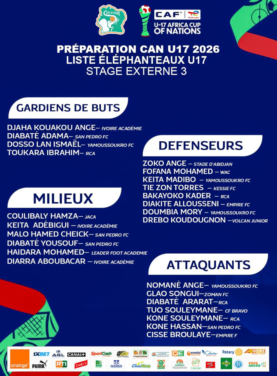 Une sélection de 25 Eléphanteaux qui est un mix entre ceux qui ont validé la qualification continentale lors du tournoi qualificatif UFOA B U17 2025 disputé à Yamoussoukro et les talents repérés lors des stages externes d’observation issus des championnats U17, Réserve, Ligue 1, Ligue 2 et Division 3.