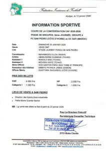 La Fédération Ivoirienne de Football a rendu public l’information relative au match FC San Pedro – OC Safi, comptant pour la 3ᵉ journée de la phase de groupe de la Coupe de la Confédération CAF 2025-2026, avec la désignation des officiels de la rencontre et les tarifs des billets.