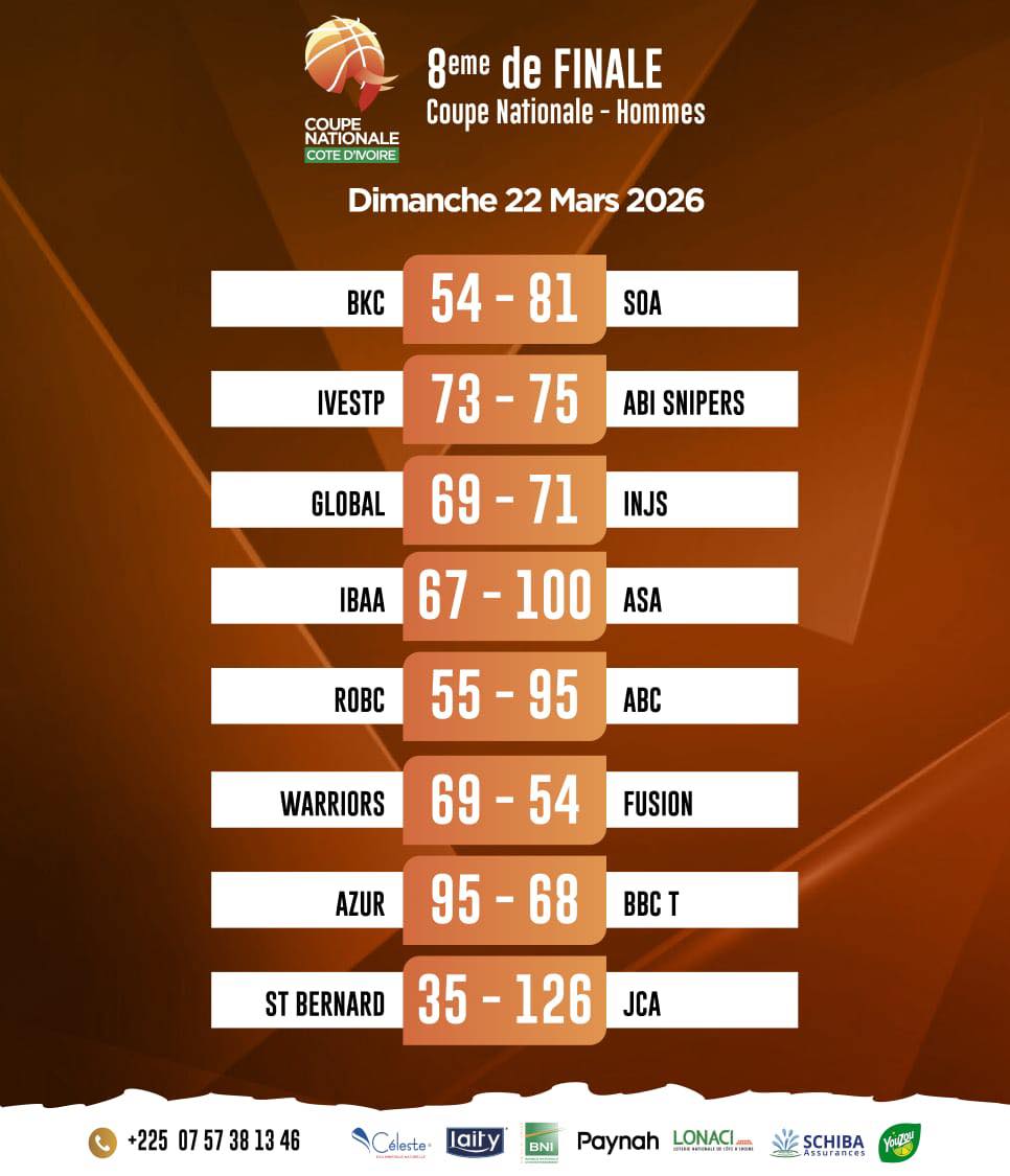Dans les autres rencontres, la SOA a dominé BKC (81-54) avec rigueur, tandis que l’ABC a également imposé sa loi face à Robc (95-55). L’Azur s’est montrée tout aussi solide en disposant de BBC T (95-68). Les matchs les plus disputés ont opposé Ivestp à Abidjan Snipers et Global à Injs. Dans ces duels serrés, les Snipers se sont imposés de justesse (75-73), tout comme l’Injs qui a arraché la victoire (71-69), confirmant le caractère indécis de ces affiches.
