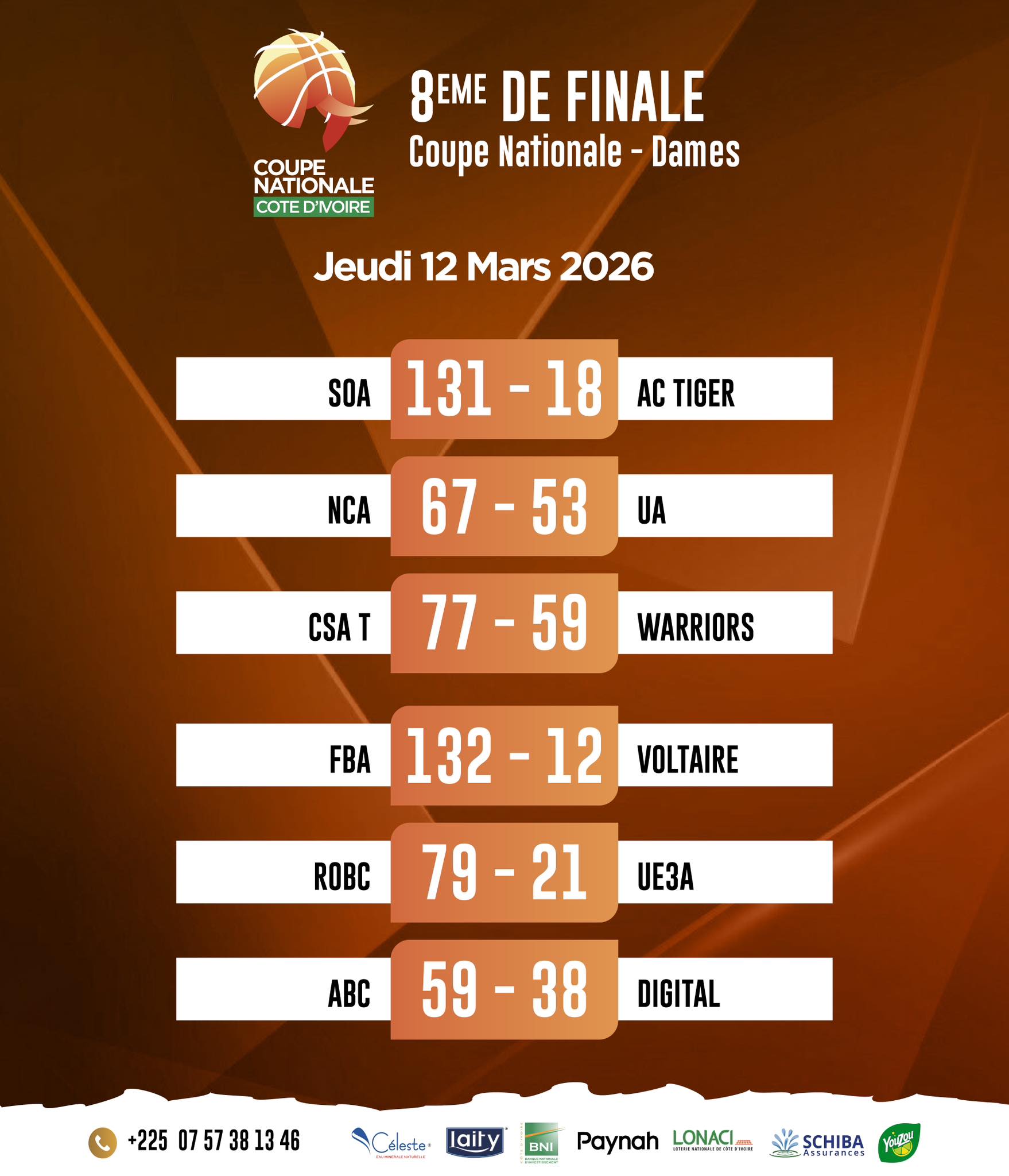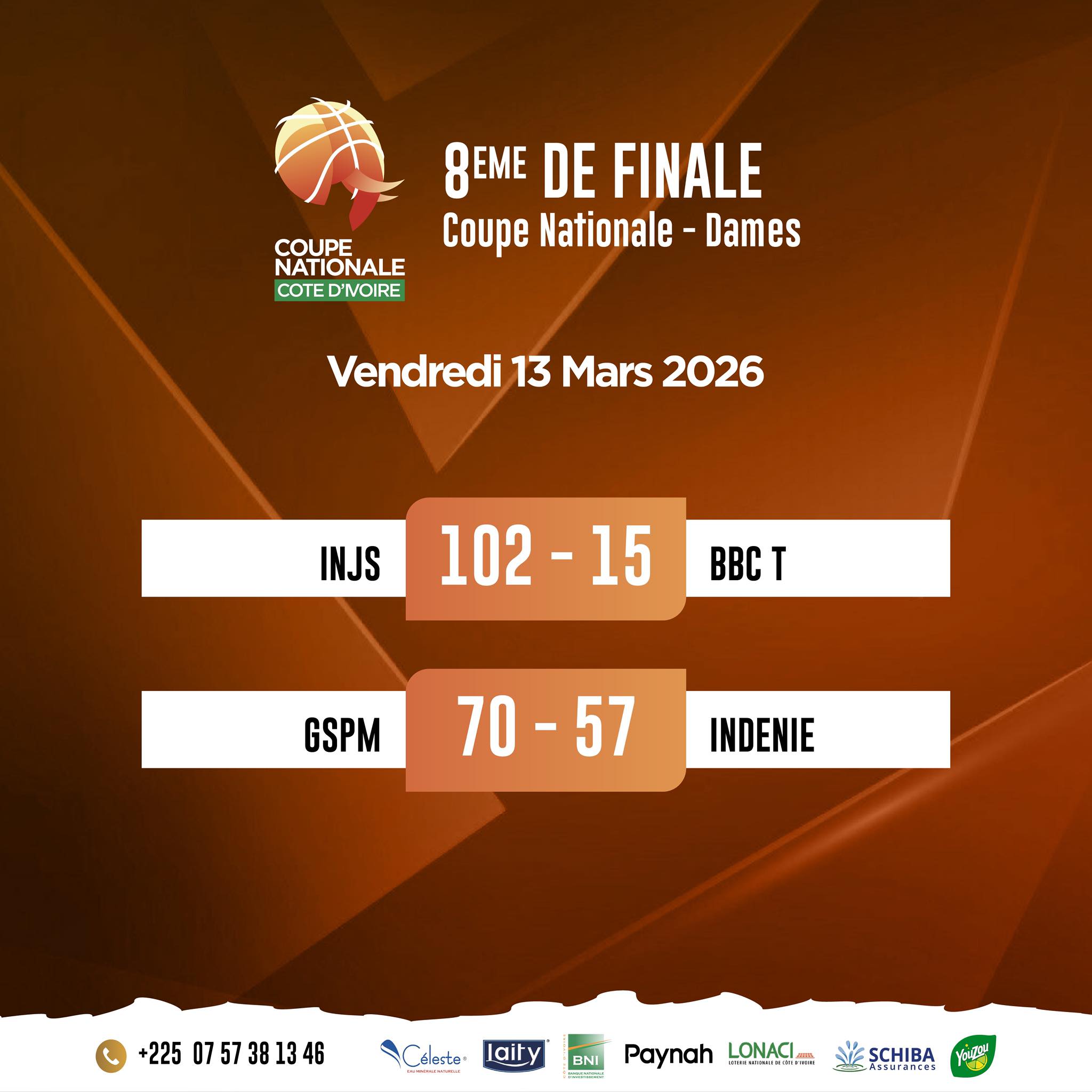 Le parquet ivoirien a vibré au rythme de la Coupe Nationale ces jeudi 12 et vendredi 13 mars 2026. Pour ces 8es de finale de la catégorie Dames, la logique a globalement été respectée, avec des démonstrations de force de la part des cadors du championnat, laissant peu de place au suspense.
