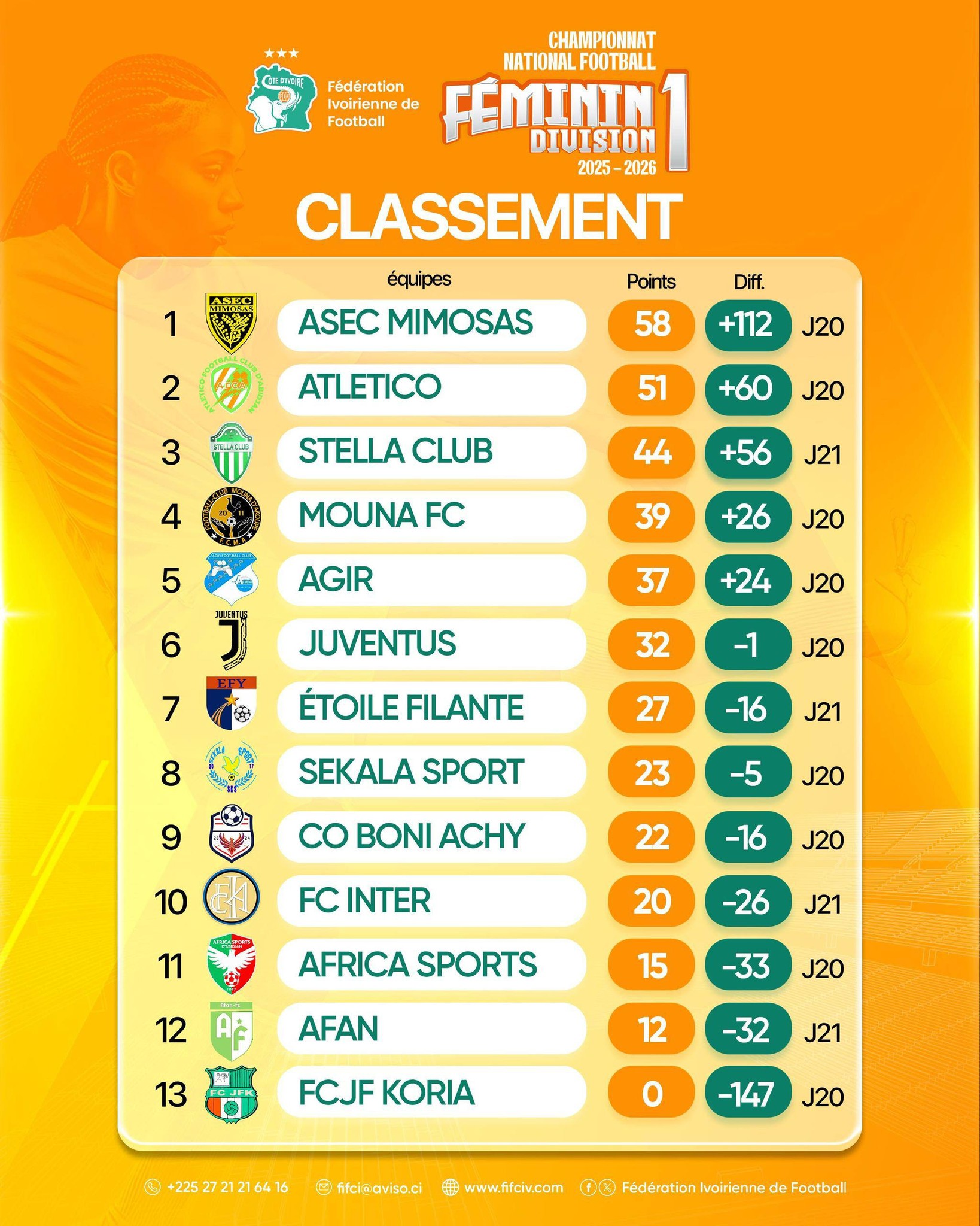 La hiérarchie a été respectée lors de cette 22e journée. L’Asec Mimosas, intouchable cette saison, a une nouvelle fois affirmé son autorité en dominant la Juventus (3-0). Une victoire maîtrisée qui permet aux Fleurs Mimosas de consolider leur fauteuil de leader avec 58 points. Au-delà du résultat, c’est surtout la différence de buts (+112) qui illustre l’écrasante domination des Mimosas sur le championnat. Derrière, l’Atletico, exempt lors de cette journée, reste dauphin avec 51 points, mais voit l’écart se creuser dangereusement.