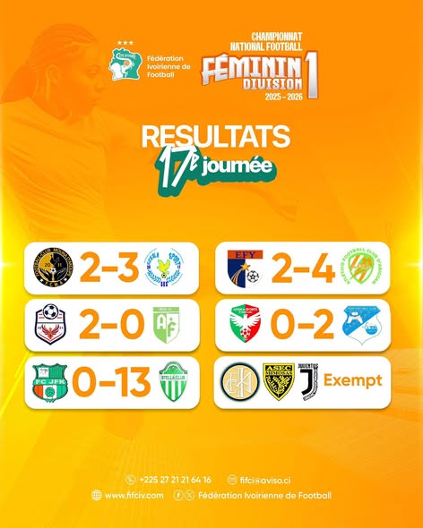 La situation devient préoccupante pour l’Africa Sports d’Abidjan. Battues (0-2) par l’Agir FC de Guiberoua, les Aiglonnes enchaînent une nouvelle contre-performance et glissent à la 11e place avec 14 points et une différence de buts de -22. Une dynamique négative qui rapproche dangereusement le club de la zone rouge. Dans le même temps, Agir FC consolide sa 5e position avec 30 points (+24), confirmant sa régularité cette saison. À noter également la victoire du CO Bony Achy (2-0) face à l’Afan, qui lui permet de se hisser à la 8e place avec 18 points. Enfin, l’Inter FC et la Juventus FC de Yopougon n’étaient pas en lice lors de cette 17e journée, tout comme l’Asec Mimosas, laissant le suspense entier en tête du classement.