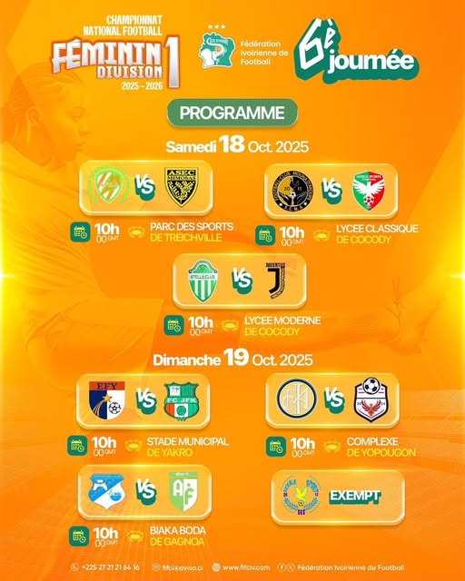 La 6e journée du championnat national féminin de Division 1 offrira ce samedi un duel au sommet entre les deux seules équipes encore invaincues : l’Atletico FC, solide leader, et son poursuivant direct, l’Asec Mimosas. Un choc qui pourrait rebattre les cartes du haut du tableau.