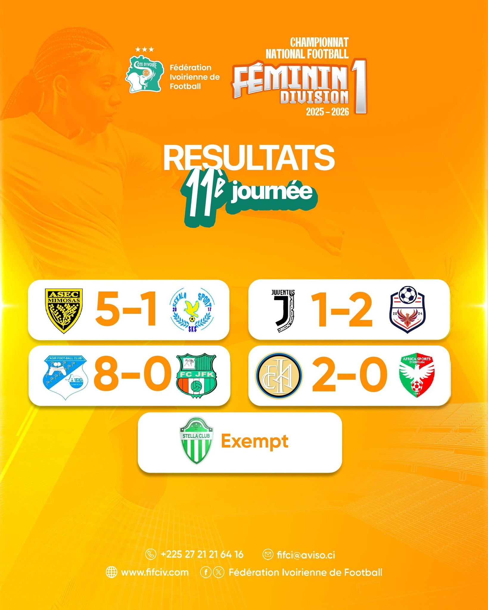 La 11ᵉ journée du Championnat national féminin de Division 1 a été marquée par l’écrasante victoire de l’Agir Guiberoua, impitoyable face au FCJF Koria, et par le retour gagnant de l’Asec Mimosas après son aventure continentale.