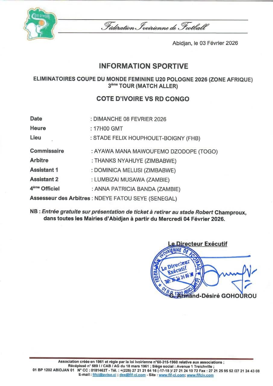 Pour ce rendez-vous crucial du 3ème tour aller ce dimanche 08 février à Abidjan, la CAF a désigné un arbitre Zimbabwéen pour diriger les débats. Afin de garantir un soutien massif aux Éléphanteaux Dames, la Fédération Ivoirienne de Football offre la gratuité totale de l’entrée au Stade Félix Houphouët-Boigny, accessible sur présentation d’un ticket à retirer dès ce mercredi.