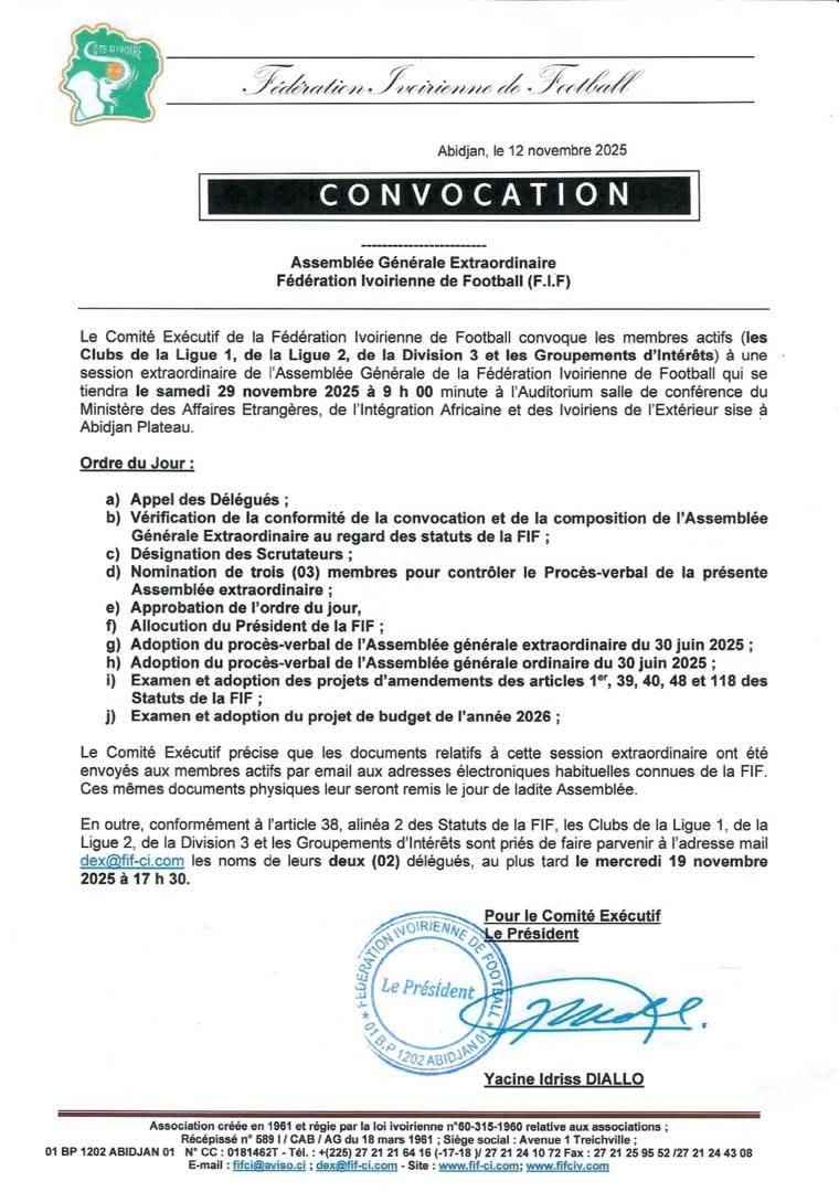 La Fédération Ivoirienne de Football (FIF) convoque ses membres actifs en Assemblée Générale Extraordinaire le 29 novembre 2025 à Abidjan. Au programme : conformité statutaire, examen de plusieurs amendements majeurs, validation des procès-verbaux et adoption du budget 2026. Une assemblée stratégique pour la gouvernance du football ivoirien.