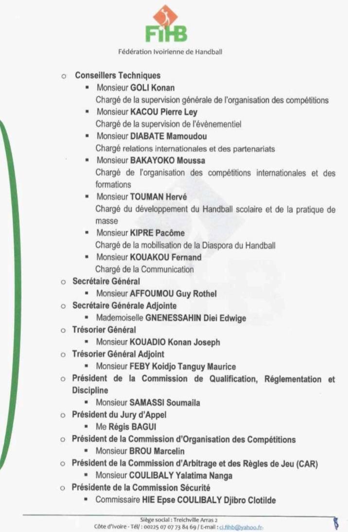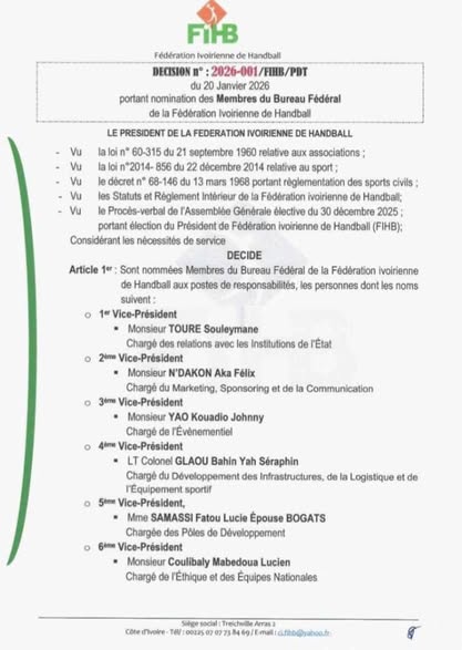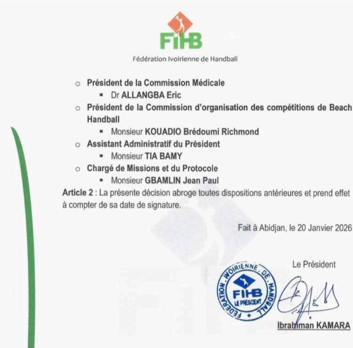 À peine installé à la tête de la Fédération Ivoirienne de Handball (FIHB), Ibrahiman Kamara a rendu public la composition de son bureau exécutif, fort de 27 membres, marquant ainsi le début effectif de son mandat.