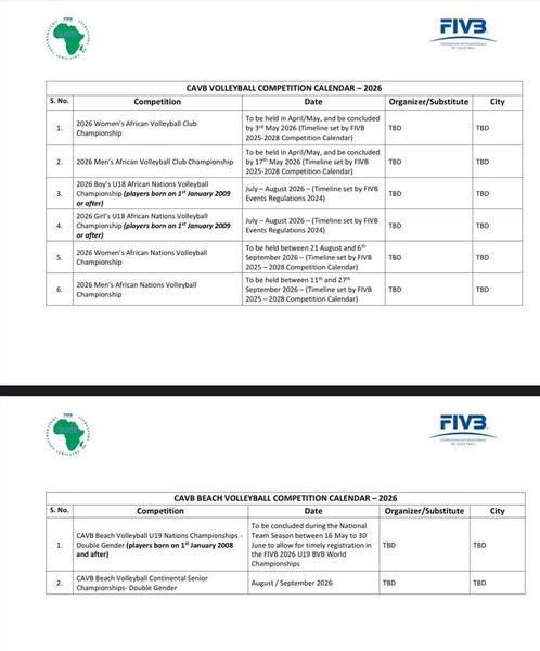 La Confédération Africaine de Volleyball (CAVB) a publié le calendrier 2026 et invite les fédérations à se porter candidates pour l’organisation des prochains événements.