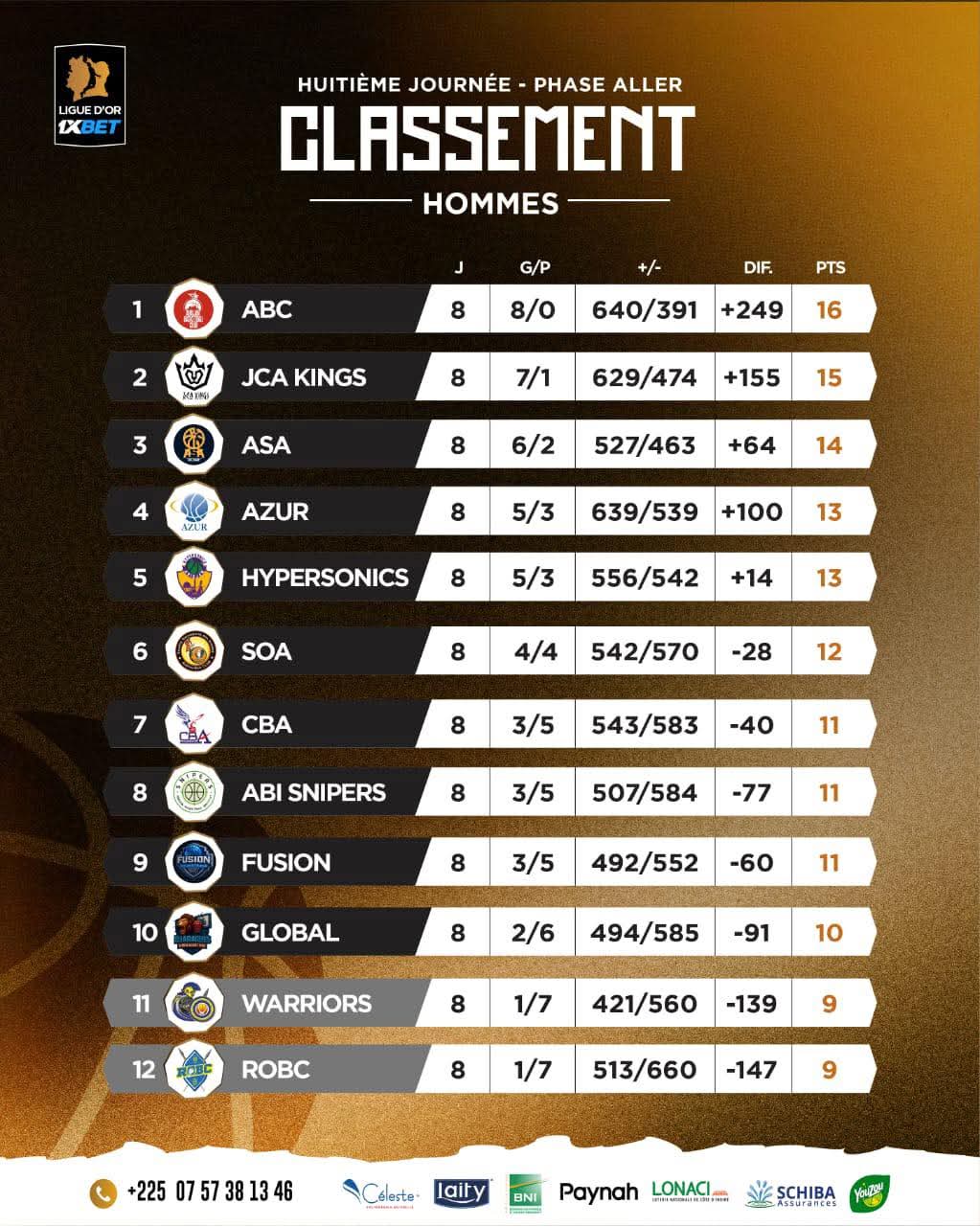 Derrière, JCA Kings poursuit sa belle dynamique. Vainqueur convaincant de la SOA (81–60), le club de Treichville s’installe à la 2ᵉ place avec 15 points. ASA, solide face à ROBC (70–55), complète le podium, tandis qu’AZUR, porté par une large victoire contre Global (85–53), reste bien placé dans la course au Top 4.