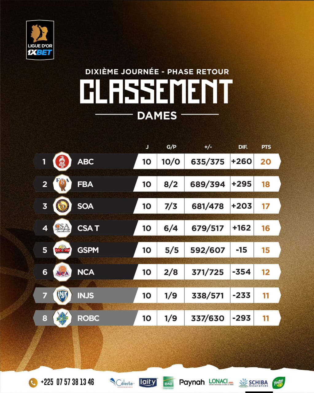 Du côté des Dames, ABC continue son parcours parfait. Les Abidjanaises ont dominé NCA (66–34) et conservent la tête du classement avec 20 points et un sans-faute impressionnant. FBA, solide deuxième, a pris le dessus sur SOA (66–59) dans un duel accroché, confirmant son ambition de conserver son titre cette saison.