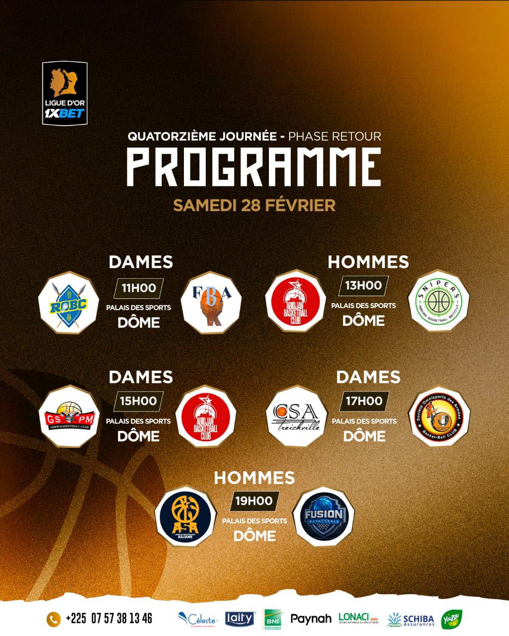 Le mano à mano entre Friend’s Basketball Association (FBA) et ABC va se poursuivre à distance sans réelle suspens. C’est un duel d’extrême qui attend FBA, 2e, face à Real Olympique Bosco Club (ROBC), dernier de la classe. Leader, ABC, va croiser les sapeurs-pompiers militaires (GSPM) qui enregistrent tout de même un bilan positif de 7 victoires contre 6 défaites. Le marathon de cette 14e journée va débuter le samedi à partir de 11H pour un dernier match à partir de 19H. Le dimanche, ce sera le même départ pour un dernier match qui va débuter à 17H.