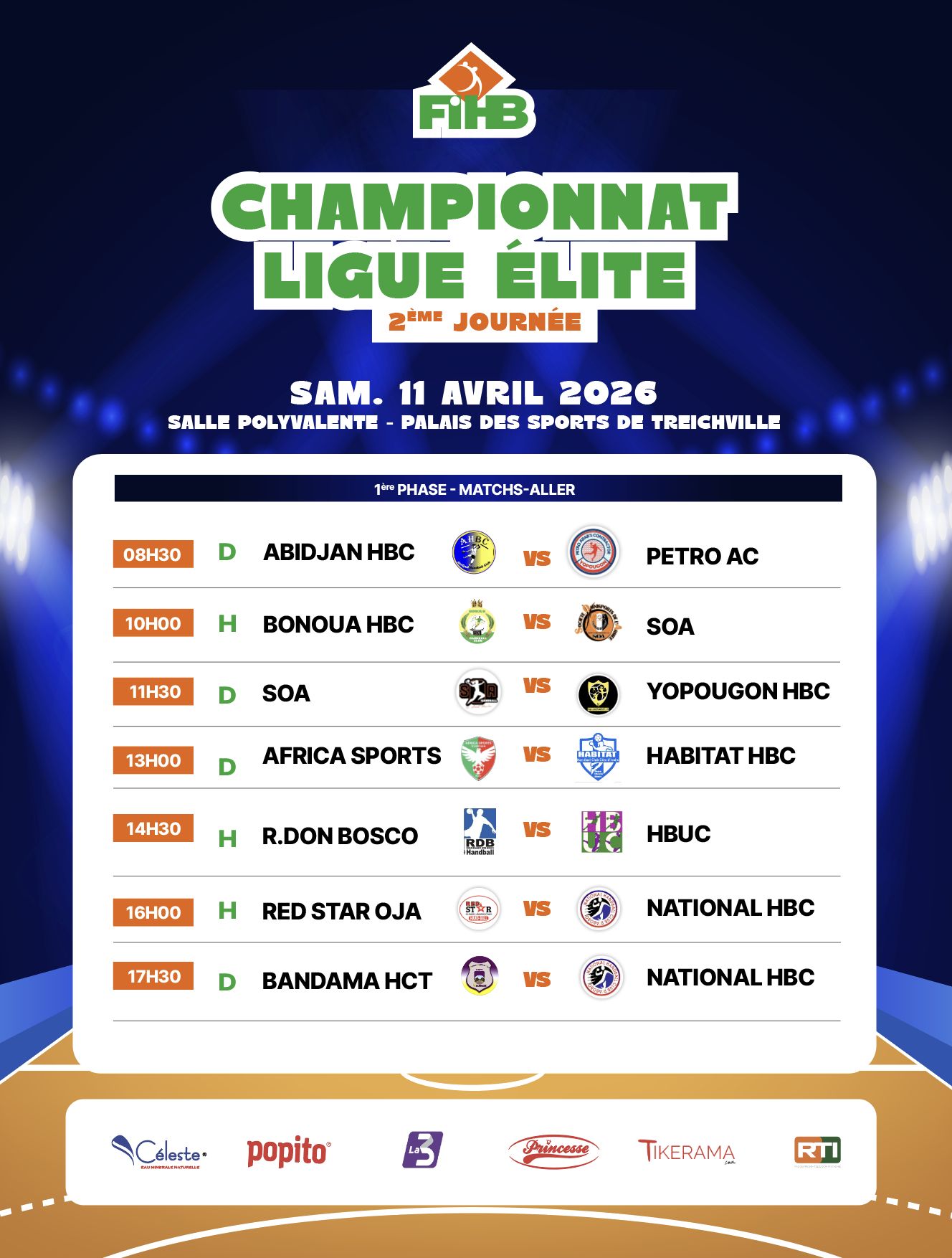 La compétition féminine s’ouvrira dès 8h30 avec l’opposition entre Abidjan Handball Club et Petro AC. Victorieuses lors de la première journée, les Abidjanaises, actuellement deuxièmes, tenteront d’enchaîner afin de s’installer durablement dans le haut du classement. Le leader, Bandama Handball Club de Tiassalé, sera également très attendu. Opposées au National à 17 heures, les joueuses de Tiassalé auront à cœur de confirmer leur excellente dynamique face à une formation en quête de rachat après son revers inaugural. Mais l’affiche la plus attendue reste sans conteste le duel entre Africa Sports et Habitat Handball Club d’Abobo à 13 heures. Deux équipes ambitieuses, toutes deux victorieuses lors de la première journée, qui viseront un deuxième succès consécutif pour s’imposer comme des prétendantes sérieuses.