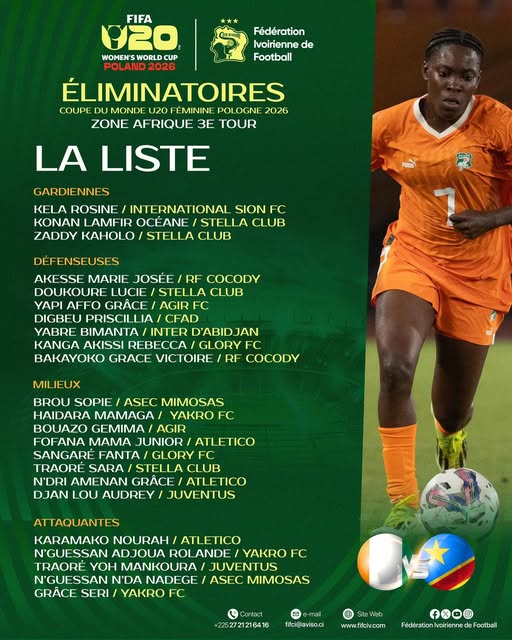 Le sélectionneur national a communiqué la liste des Éléphantes U20 retenues pour la double confrontation face à la République démocratique du Congo, comptant pour le troisième et avant-dernier tour des éliminatoires de la Coupe du Monde Féminine U20 Pologne 2026, prévue les 8 et 14 février.