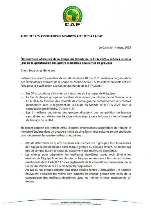 Dans un courrier en date du 14 mars, la FIFA a rappelé à toutes les associations membres affiliées à la Confédération Africaine de Football (CAF), la mise à jour du critère des 4 meilleurs deuxièmes des groupes. 1 donnée qui a pour conséquence 1 changement dans le classement actuel des barragistes.