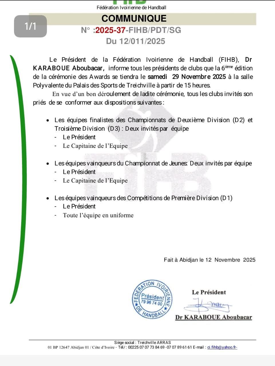La Fédération Ivoirienne de Handball a officialisé la date de la 6ᵉ édition des Handball Awards, prévue pour le samedi 29 novembre 2025. Cette cérémonie, devenue un moment fort du calendrier sportif national, mettra à l’honneur les joueuses, joueurs et encadreurs qui ont marqué la saison 2024-2025.