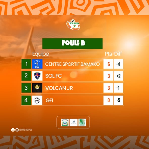 Déjà impressionnant lors de son entrée en lice, le Centre Sportif Bamako a remis ça en dominant GFI (5–2). Avec 6 points (+4), il s’impose comme l’une des équipes les plus séduisantes de ce TIDA 10. Derrière lui, la lutte s’annonce féroce pour l’unique ticket restant : SOL FC et Volcan Junior, tous deux à 3 points, sont au coude-à-coude. GFI, dernier du groupe avec 0 point, voit ses espoirs de qualification fortement compromis.