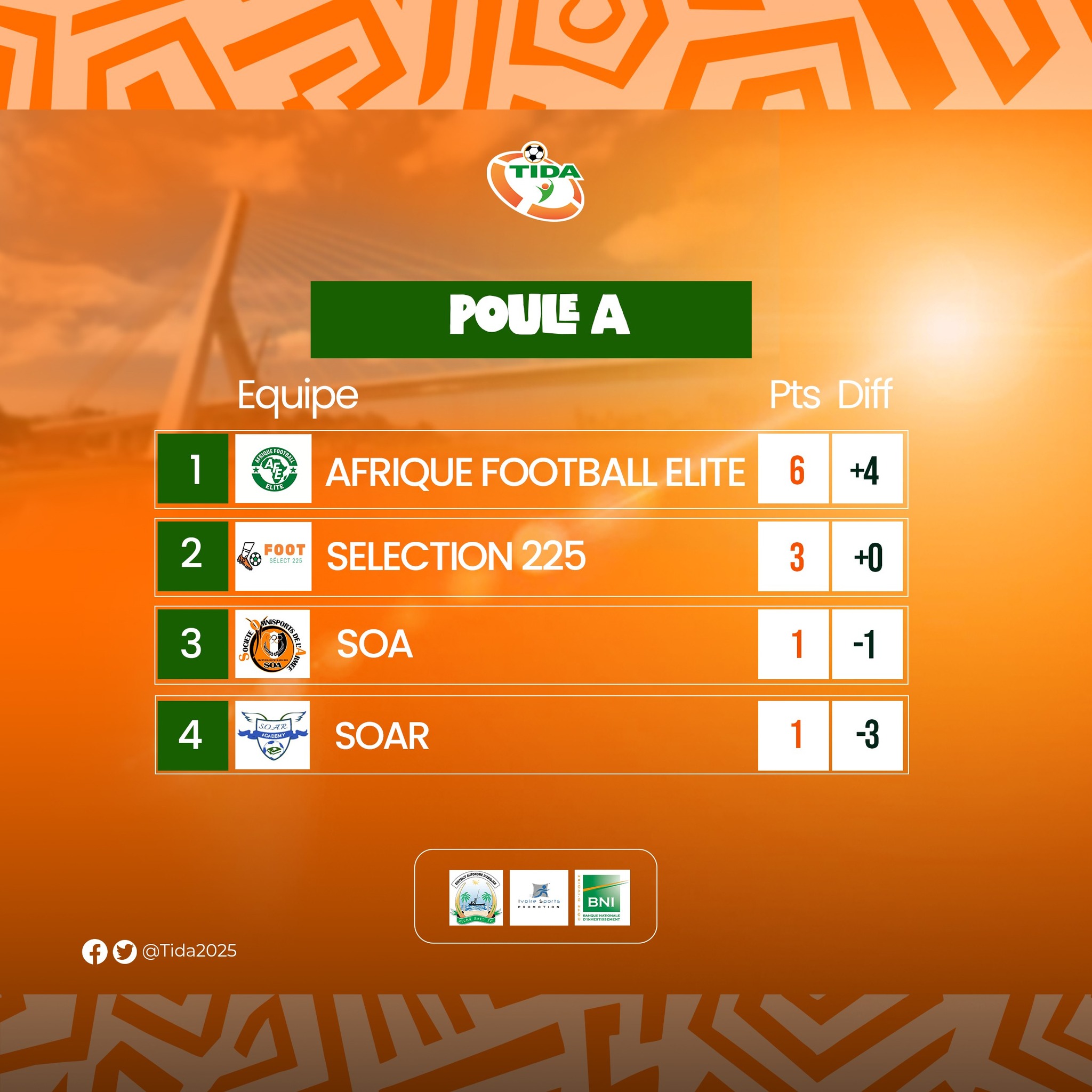 Avec deux victoires en autant de matches, Afrique Football Elite caracole en tête du groupe avec 6 points (+4). Les jeunes Maliens déroulent un football efficace, solide défensivement et tranchant dans les transitions. En embuscade, la Sélection 225 totalise 3 points et conserve toutes ses chances pour les quarts, mais devra impérativement s’imposer lors de la dernière journée.